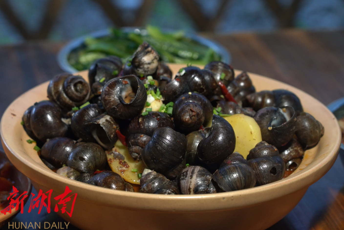 在铜湾镇内的农家乐和餐饮店,铜湾田螺一直是客人必点的招牌菜,产自山区的田螺经过大厨的爆炒焖煮,散发出诱人的香气。短视频博主“铜湾妹陀”正 对着镜头大快朵颐,“这田螺肉质紧实弹牙,带着山泉水的清甜,绝对是‘舌尖上的铜湾’!” 如今,铜湾田螺已形成从种养到加工、餐饮的完整产业链,成为当地乡村振兴的“金名片” 。
