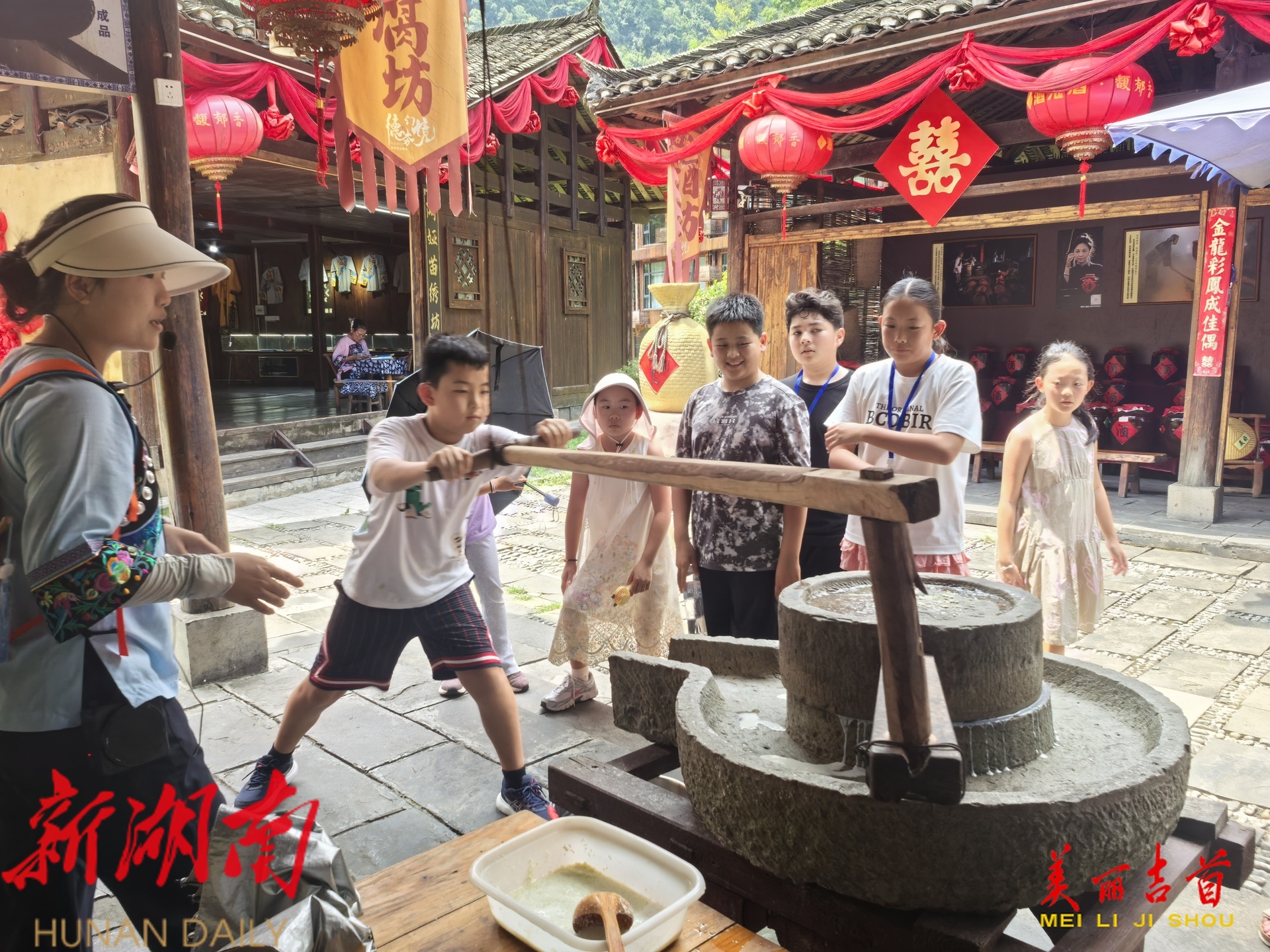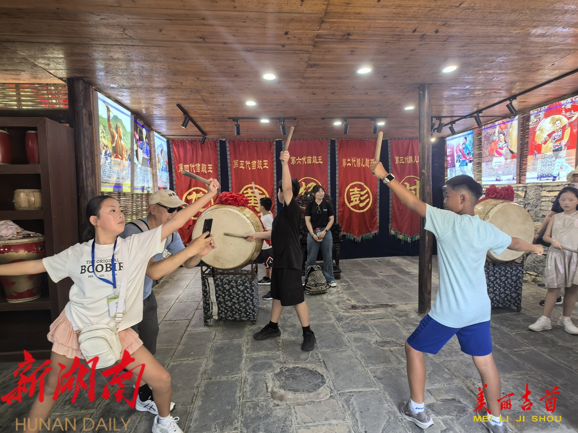 在德夯苗寨,孩子和家长们沉浸式体验了苗家拦门酒、对歌等原生态民族风情。来到鼓文化馆,孩子们在苗鼓非遗传承人指导下学习苗族鼓舞,随着鼓槌挥动,咚咚鼓点声让传统文化鲜活起来。孩子们陆续参观了传统磨坊、油坊、手工艺店铺,亲身感受湘西农耕文化的独特魅力。