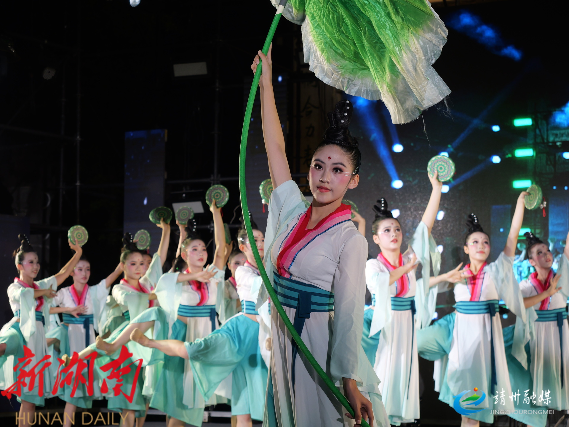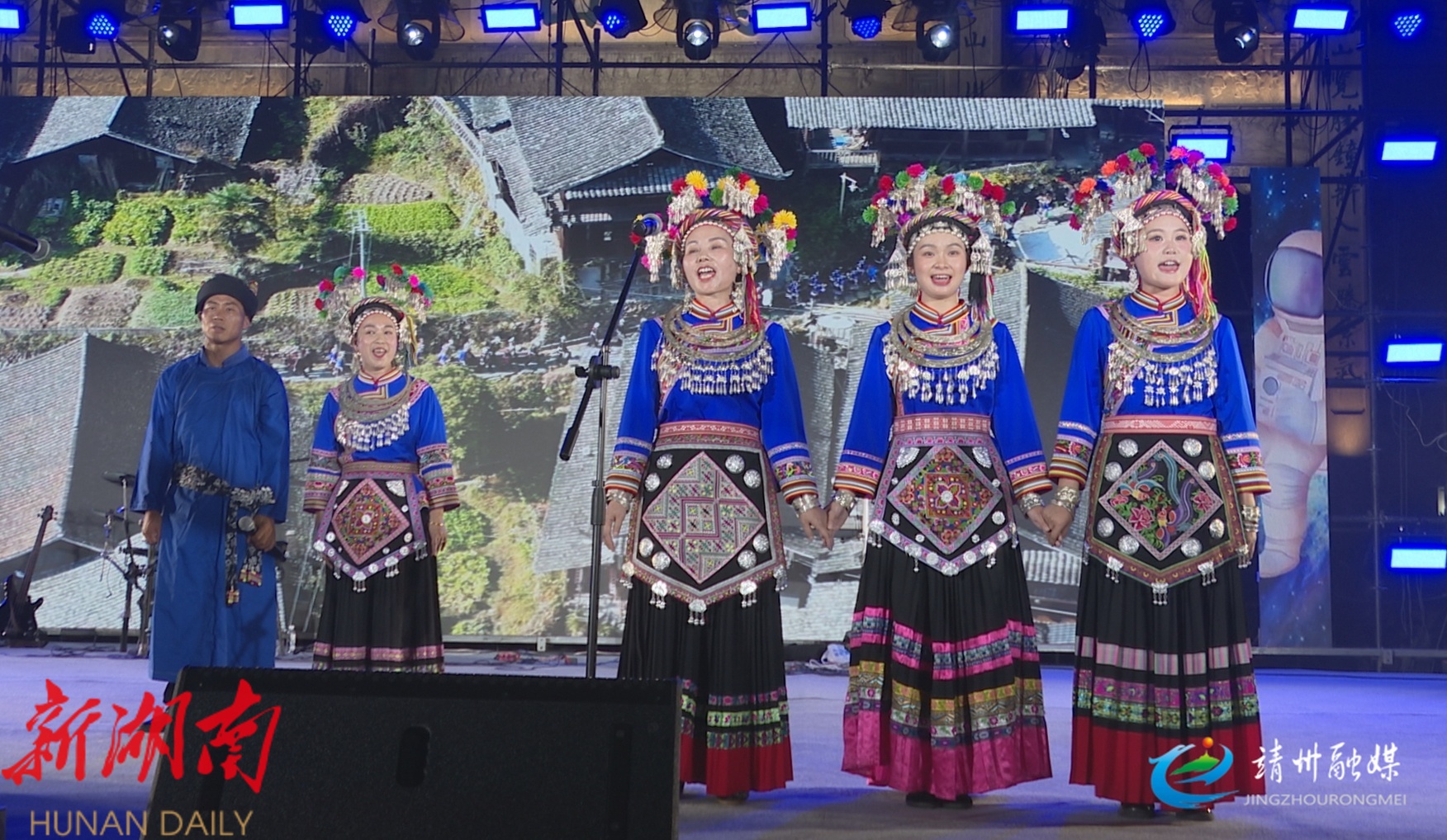活动开场,国家级非物质文化遗产苗族歌鼟的多声部无伴奏合唱率先登场,以独特韵味展现靖州深厚文化底蕴;群舞《莲鼓越歌行》以灵动舞姿与欢快节奏点燃现场气氛;锹里情歌对唱婉转悠扬,传递出浓郁的苗侗民族风情,让观众沉浸式感受民族文化魅力。