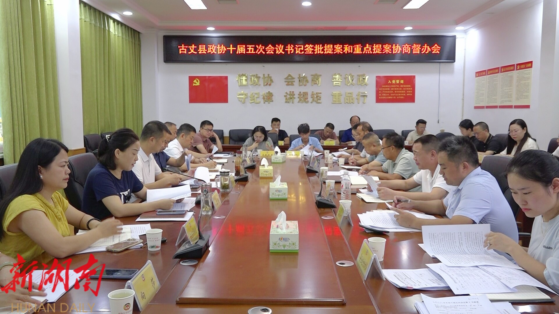 新湖南客户端7月18日讯(通讯员 杨文馨)7月17日,古丈县政协十届五次会议书记签批提案和重点提案协商督办会召开,县政协主席宋祖林,副主席李林华、向春艳,提案主、会办单位相关负责人,县政府督察室及县政协机关人员参加会议。