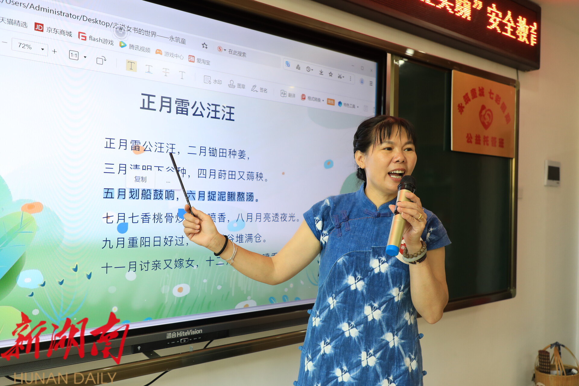 活动中,孩子们一同跟着传承人学唱女书童谣《正月雷公汪汪》,朗朗上口的曲调格外动听,引得大家纷纷开口跟唱,清脆稚嫩的童声此起彼伏,与传承人的领唱交织在一起,在活动室里汇成一曲欢快的合唱。