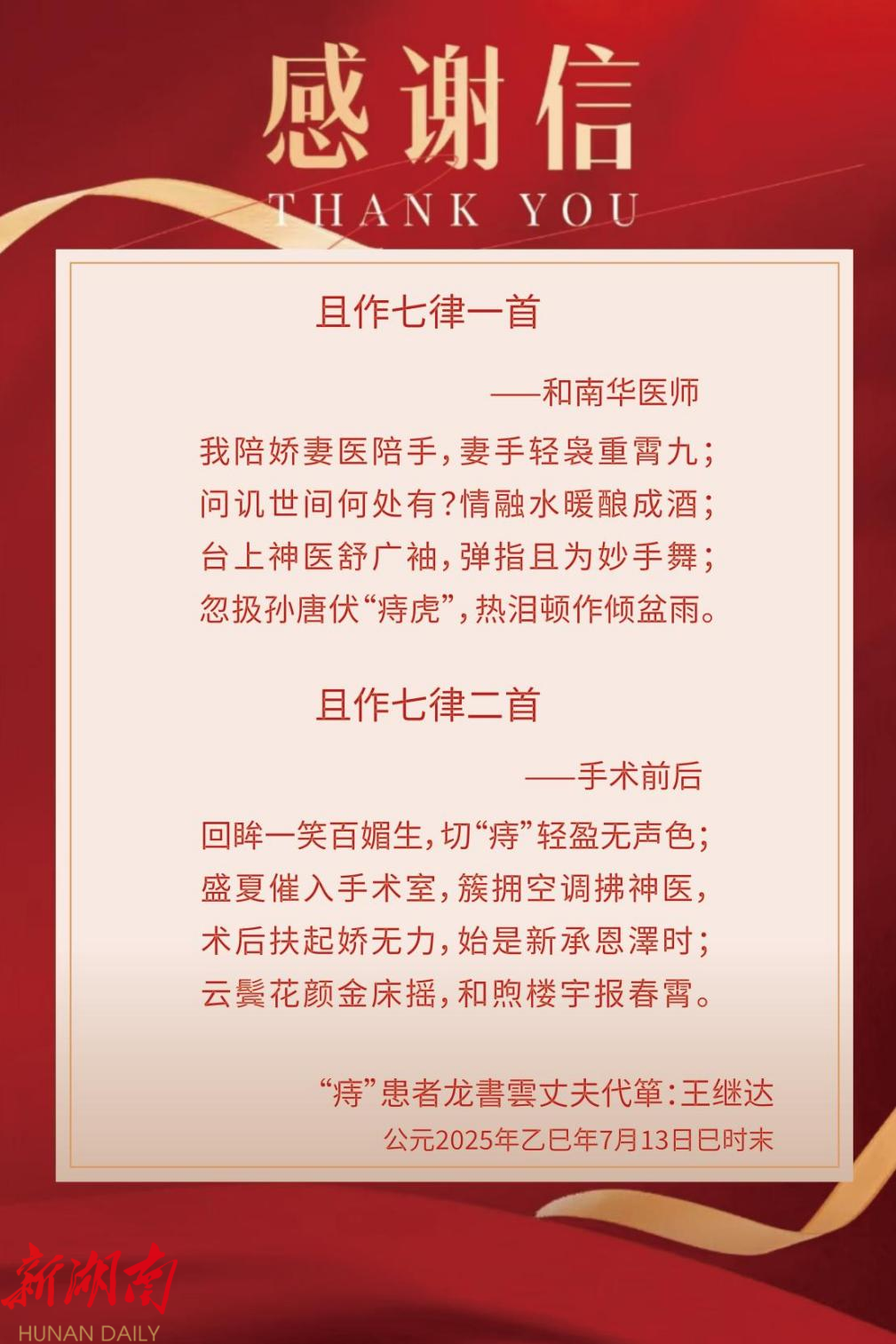 衡东融媒7月18日讯(通讯员 肖琪 李颖 )近日,南华大学附属南华医院肛肠科凭借精湛医术与贴心服务,成功为一名饱受痔疮折磨的患者解除病痛,以精准微创手术搭配全程无痛化管理,赢得了患者及其家属的高度赞誉。患者丈夫在出院前夕满怀感激,即兴创作两首七律,字里行间尽显对全体医护人员的肯定与满意。