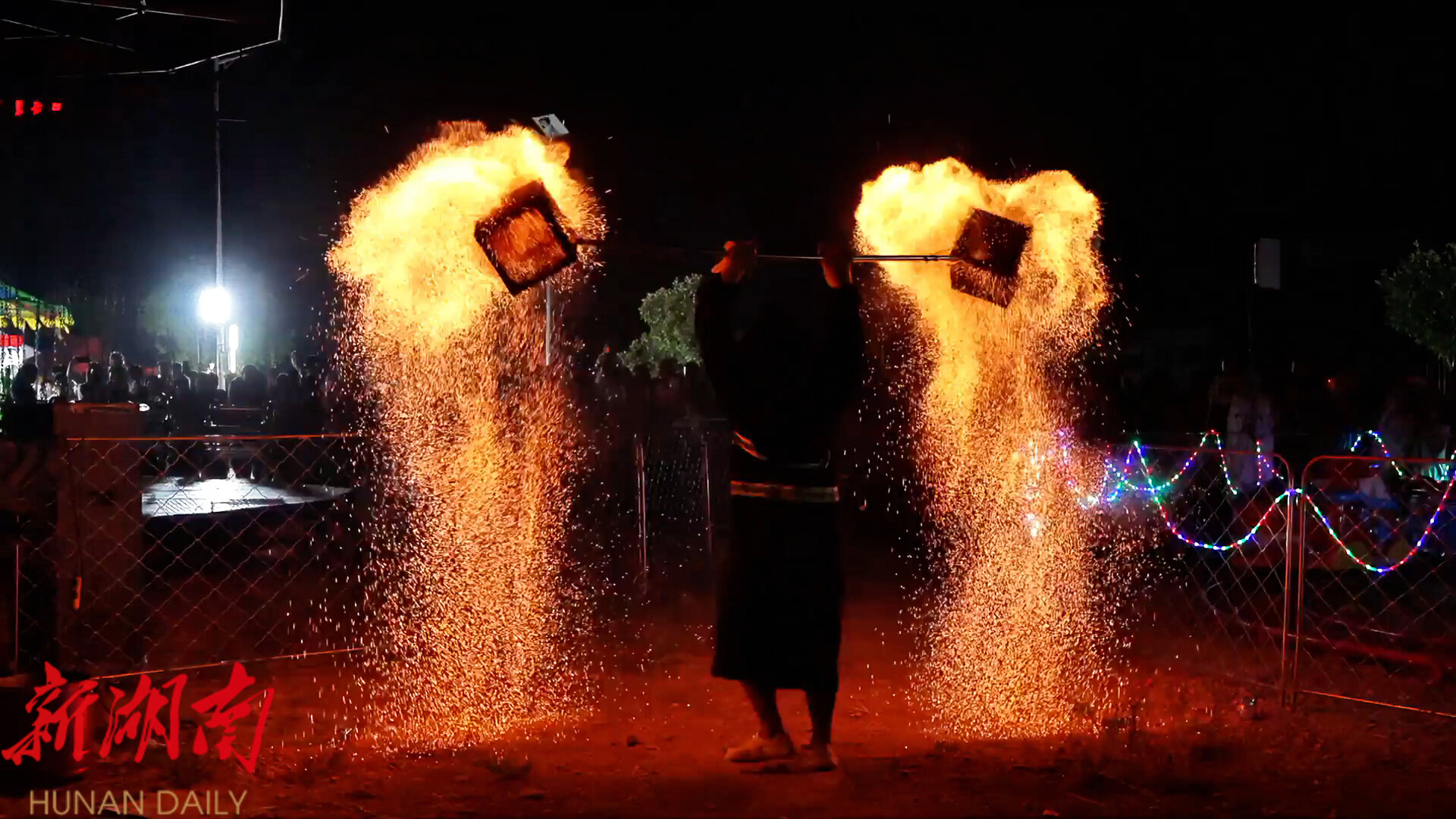 当天晚上八点,打铁花艺人用特制的木勺将高温熔化后的铁水用力舞动,只见铁水溅起十几米高的金色火花,漫天飞射,层层飞花如瀑布飞泻,又如同烟花一般照耀夜空,流光溢彩、耀眼夺目,呈现出“铁树银花落,万点星辰开”的场景,为观众带来了一场精彩壮观的视觉盛宴。