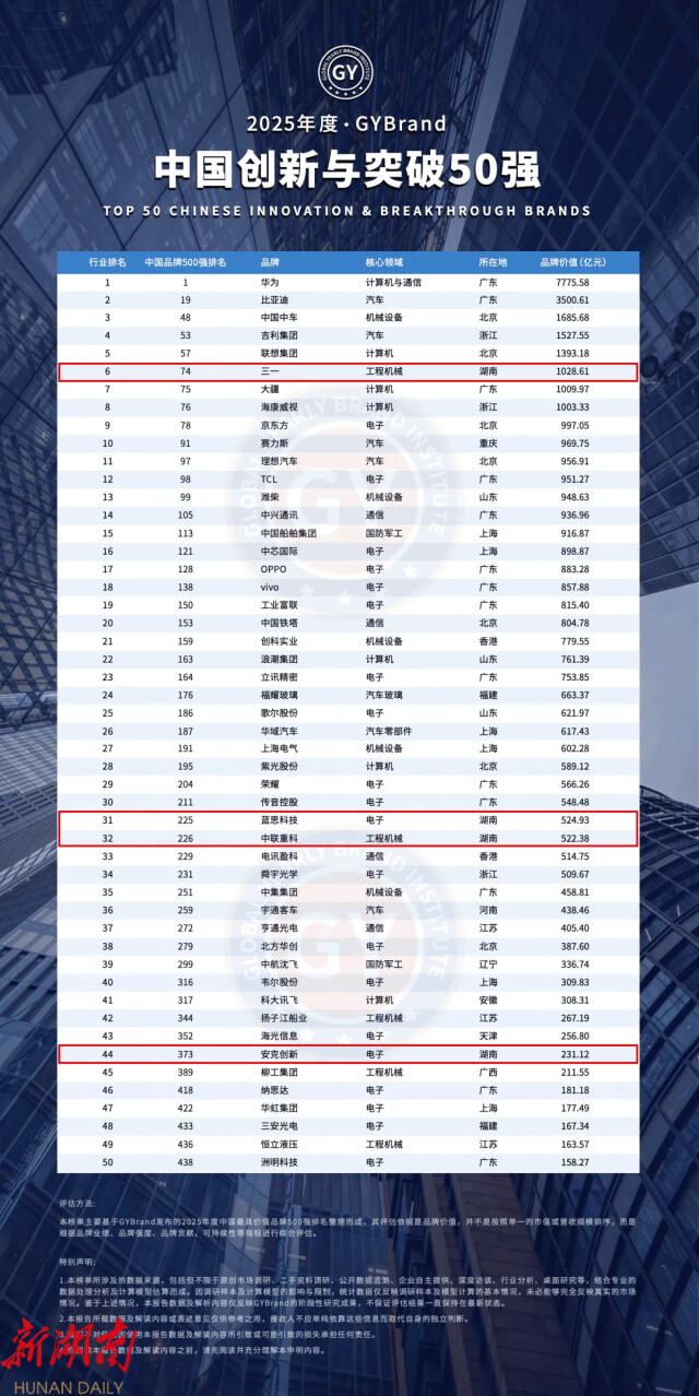知名品牌评估机构GYBrand全球品牌研究院,近日揭晓“2025年度中国创新与突破50强”榜单。湖南4家企业上榜,分别是工程机械巨头三一集团、中联重科,电子视窗防护玻璃龙头蓝思科技,智能充电与音频领域先锋安克创新,分别位列第6、31、32、44位。据省工信厅统计,本次湖南上榜数量居全国第四、中部第一。