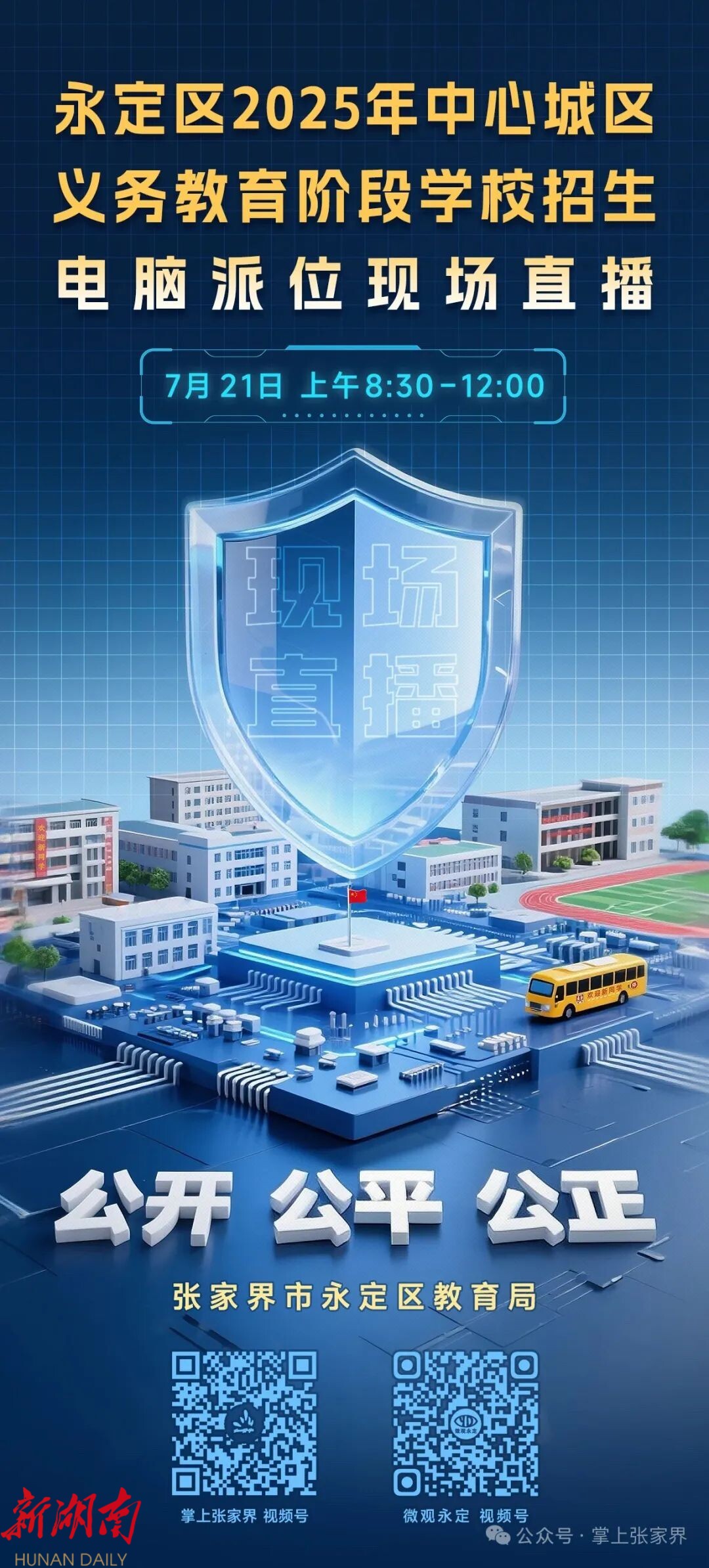 7月2 1 日上午 8:30—12: 0 0 , 掌上张家界、微观永定等 网络平台将现场直播永定 区 202 5 年中心城区义务教育阶段学校招生电脑派位工作全过程。 此次现场直播将 邀请市、区两级党代表、人大代表、政协委员 9名,纪检监察人员2名,学生家长代表10名,学校教师代表12名全程参与监督,张家界市胜地公证处2名公证员将现场进行公证。欢迎全体市民朋友届时观看并积极监督。