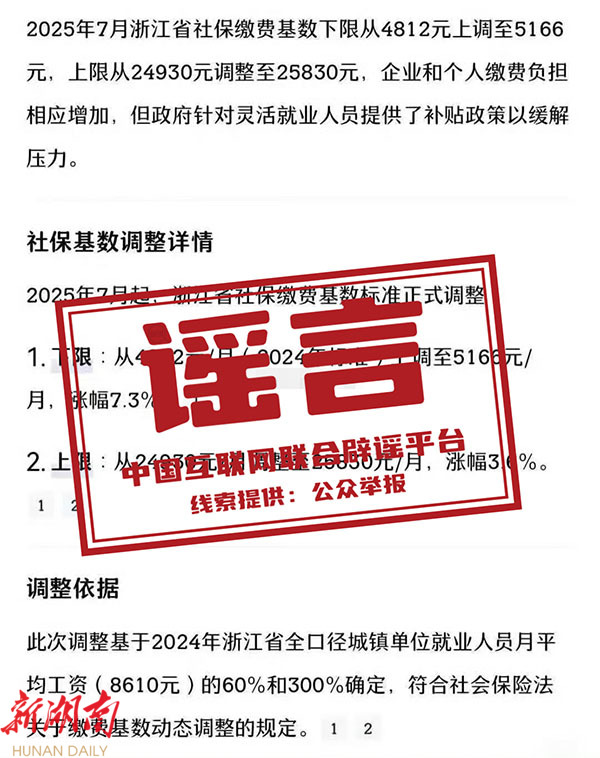 真相: 近日,“2025年杭州社保基数下限上调至5166元”“2025社保缴费基数调整通知”等相关信息在部分自媒体平台传播。经核查,此为不实信息。杭州市人力社保局相关负责人表示,目前尚未接到上级关于调整今年社保缴费基数的通知,也没有开展缴费基数调整工作,相关信息以官方发布为准,切勿信谣传谣。(来源:“杭州人社”微信公众号)