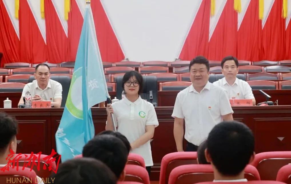 随后,参加实践活动的大学生代表依次发言,分享参与此次实践活动的期待与规划。付振南为参加暑期实践活动的大学生队伍授旗。