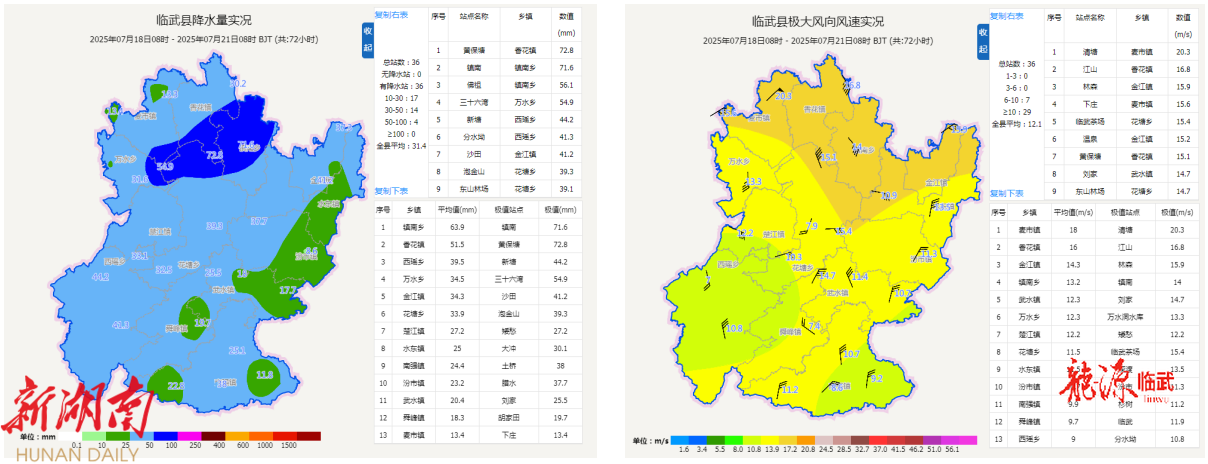 图1 2025年7月18日08时至21日08时全县累计雨量(左)和极大风分布(右)图