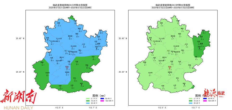 图3 7月21日08时至22日08时和7月22日08时至23日08时临武县降雨量预报图