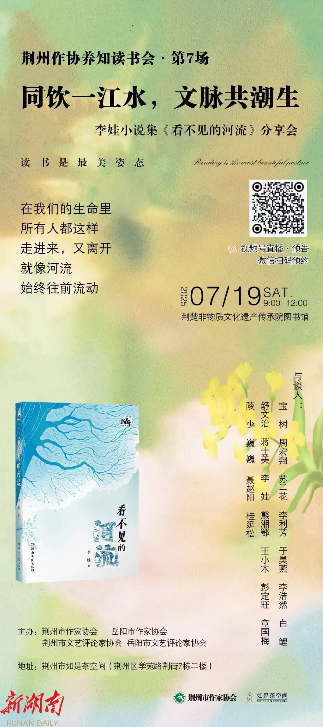 湖南日报·新湖南客户端7月21日讯(通讯员 罗正坤 ) 7月19日,湘阴作家李娃携新书亮相湖北荆州分享会,探讨文学的魅力。此次活动由荆州市作协、评协与岳阳市作协、评协联合主办,20余位来自全国各地的知名作家、评论家线上线下齐聚一堂,共同研讨青年作家李娃新作小说集《看不见的河流》,活动全程直播,吸引全国文学爱好者同步参与。