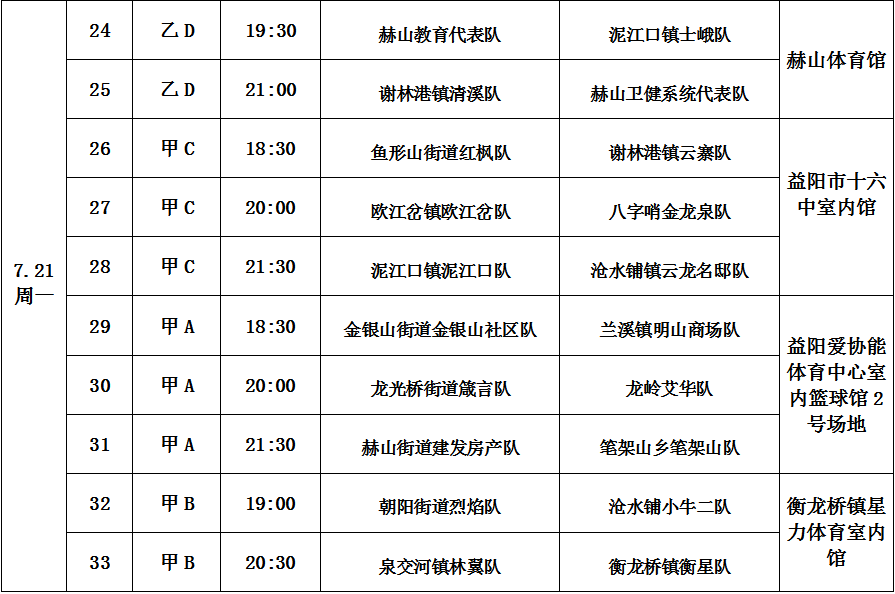 因天气原因,为确保赛事按赛程顺利进行,原定2025年7月21日举行的小组赛场地作出如下调整:甲A组比赛由沧水铺镇碧云峰体育公园多功能篮球场转移至益阳爱协能体育中心室内篮球馆2号场地;甲B组比赛由衡龙桥镇星力体育篮球场转移至衡龙桥镇星力体育室内馆;甲C组比赛由沧水铺镇碧云峰体育公园主篮球场转移至市十六中室内馆。