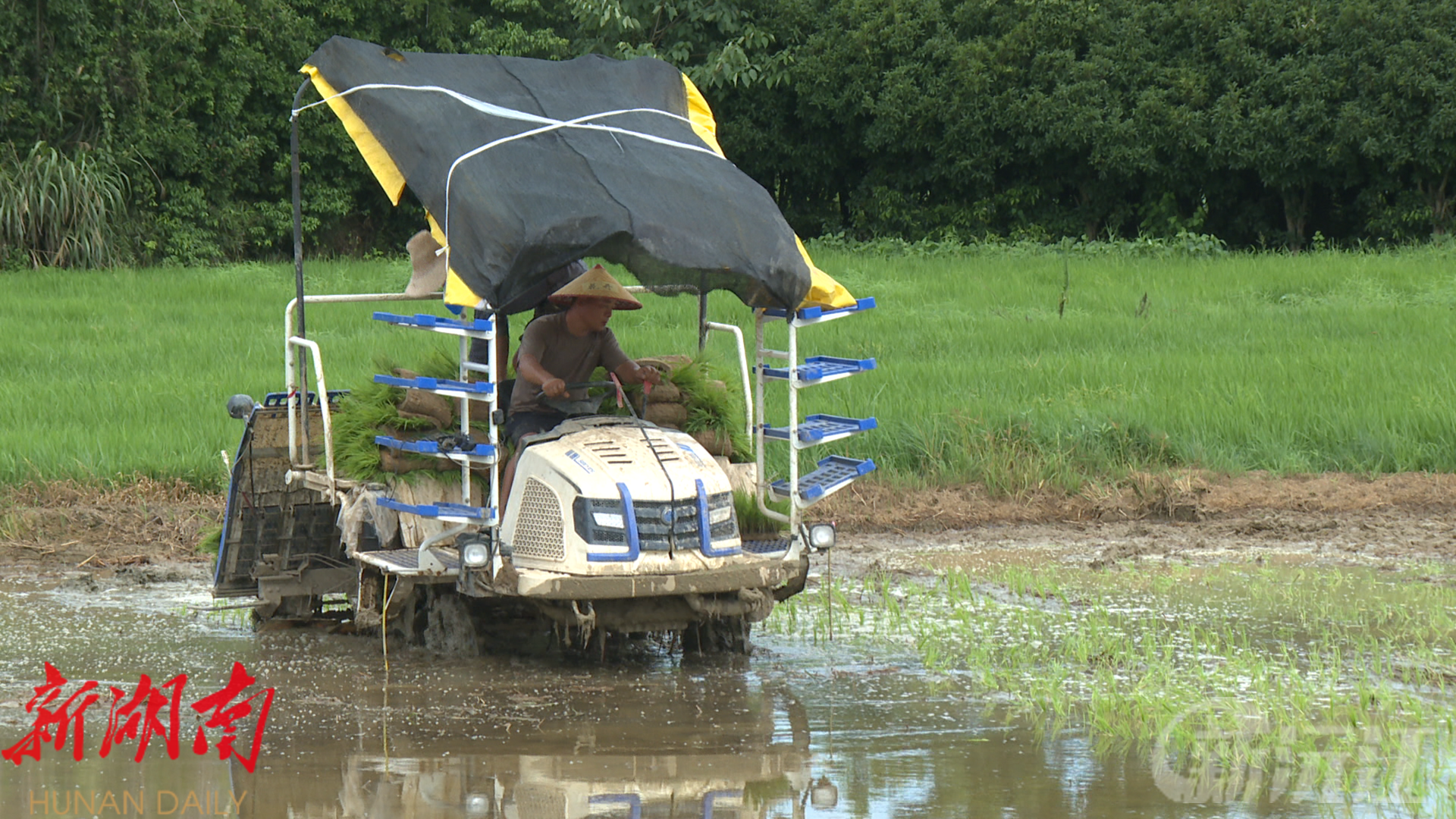 在沅江市琼湖街道保民现代谷物种植专业合作社的水稻种植基地,一台新式插秧机正在作业。市农技人员钟乐辉和基地负责人一起来到田间地头,俯身查看水稻根系发育与叶片舒展情况,同时针对当前持续高温天气,手把手指导农户加强田间管理。