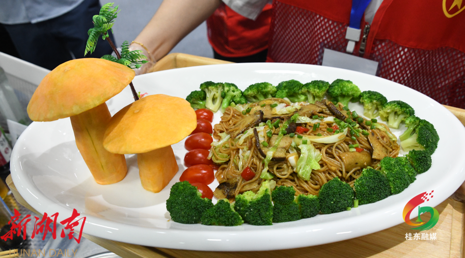 桂东县参赛选手胡建辉:我今天做的是“桂东黄菌炒粉”,采用的是(桂东)本地食材,黄菌、高山包菜、腊肉,还有冷水米做的米粉。