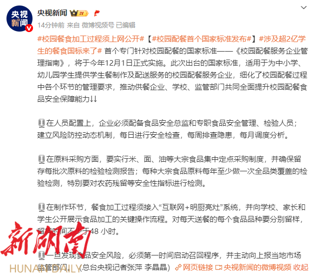 首个专门针对校园配餐的国家标准——《校园配餐服务企业管理指南》,将于今年12月1日正式实施。 此次出台的国家标准,适用于为中小学、幼儿园学生提供学生餐制作及配送服务的校园配餐服务企业,细化了校园配餐过程中各个环节的管理要求,推动供餐企业、学校、监管部门共同全面提升校园配餐食品安全保障能力。