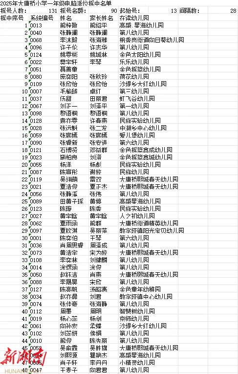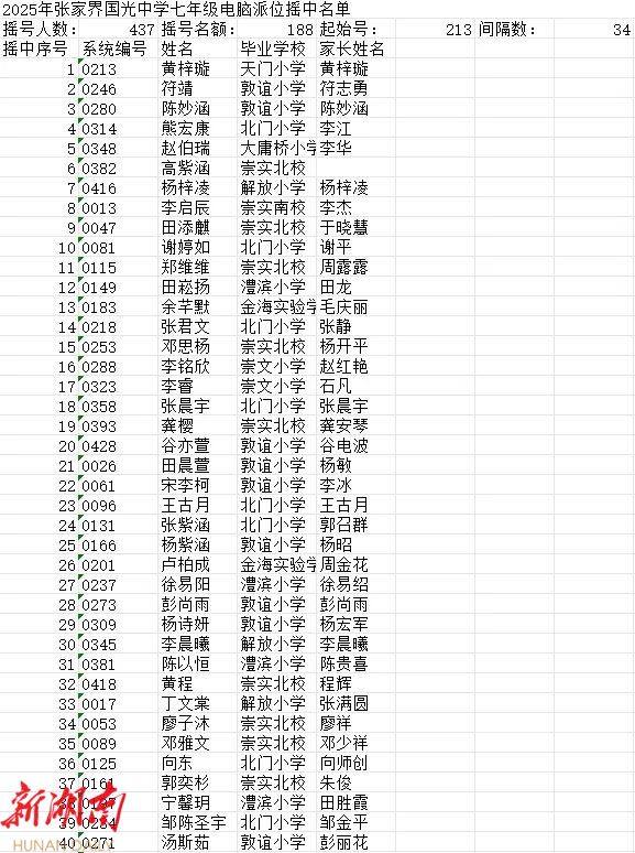 今年参加永定区2025年中心城区义务教育阶段学校招生电脑派位的学校有永定区大庸桥小学、永定区西溪坪小学、张家界国光中学、张家界市民族中学共4所。通过电脑派位,永定区大庸桥小学分派了一年级新生90人,永定区西溪坪小学分派了一年级新生49人,张家界国光中学分派了一年级新生188人,张家界市民族中学分派了一年级新生94人。参加电脑派位没有被分派的学生,由区教育局统筹安排到中心城区其他有空余学位的中小学校就读。(永定区融媒体中心记者 谢丽琼 实习记者 覃圣洁)