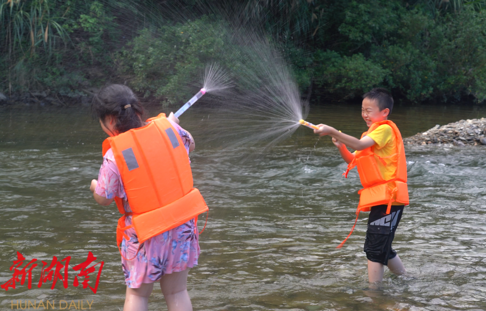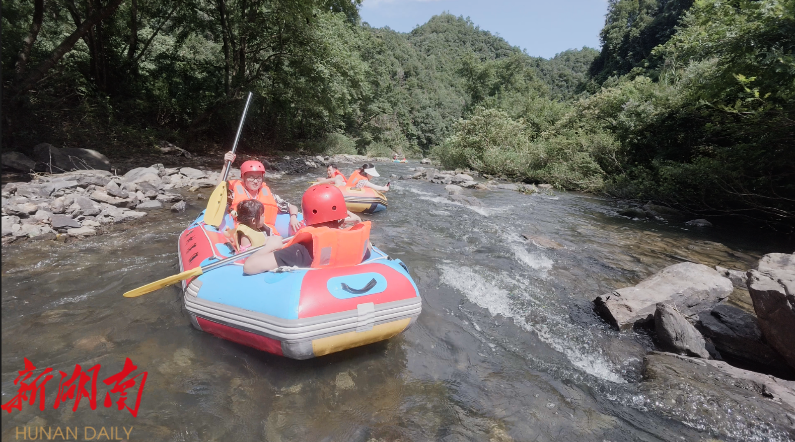 漫步梅树村,5公里长的生态漂流河道宛如玉带蜿蜒山间。游客们全副武装,乘着色彩明艳的皮划艇穿行在青山绿水间。时而轻荡双桨,聆听山鸟啁啾;时而勇闯激流,体验浪遏飞舟的快意。来自怀化的游客刘权兴奋地表示:“这已经是我们全家第三次来了,完善的安保措施让亲子游玩很放心,漂流、桨板、野泳等项目老少皆宜,每次都有新体验!”