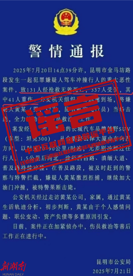 详情: 近日,一则内容为“昆明市金马坊路段发生一起犯罪嫌疑人驾车冲撞行人的重大恶性案件,致131人经抢救无效死亡,337人受伤,其中41人重伤”的“警情通报”在网上流传,引发社会关注。经核实,该“警情通报”系谣言。真实情况是:7月20日13时16分,云南省昆明市西山区金碧路发生一起道路交通事故。经昆明市公安局查实,李某某(男,49岁,昆明市西山区人)驾驶一辆蓝色小型越野车行驶至金碧路时,撞上正常行驶的电动自行车及行人,随后驾车逃逸途中又与其他车辆及行人发生碰撞。事故共造成2人死亡,4人轻伤,5人轻微伤,受伤人员已送医院救治,无生命危险。目前,公安机关已将李某某抓获,已排除酒驾、毒驾嫌疑。初步查明属交通肇事逃逸,事故正在进一步调查处理中。(来源:“网信云南”微信公众号)