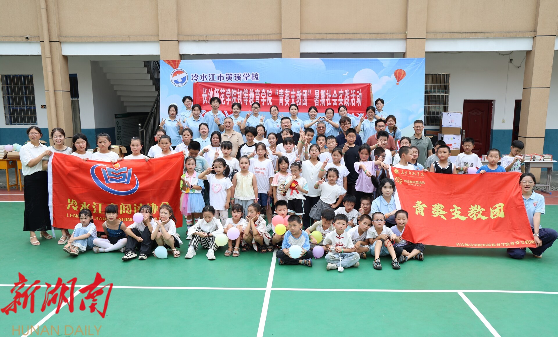 湖南日报·新湖南客户端7月22日讯(通讯员 朱俊峰)近日,长沙师范学院初等教育学院向日葵支教协会青葵支教团的18名志愿者走进冷水江市沙塘湾街道筻溪学校,开启为期16天的暑期夏令营,带领乡村孩子开展主题实践活动。