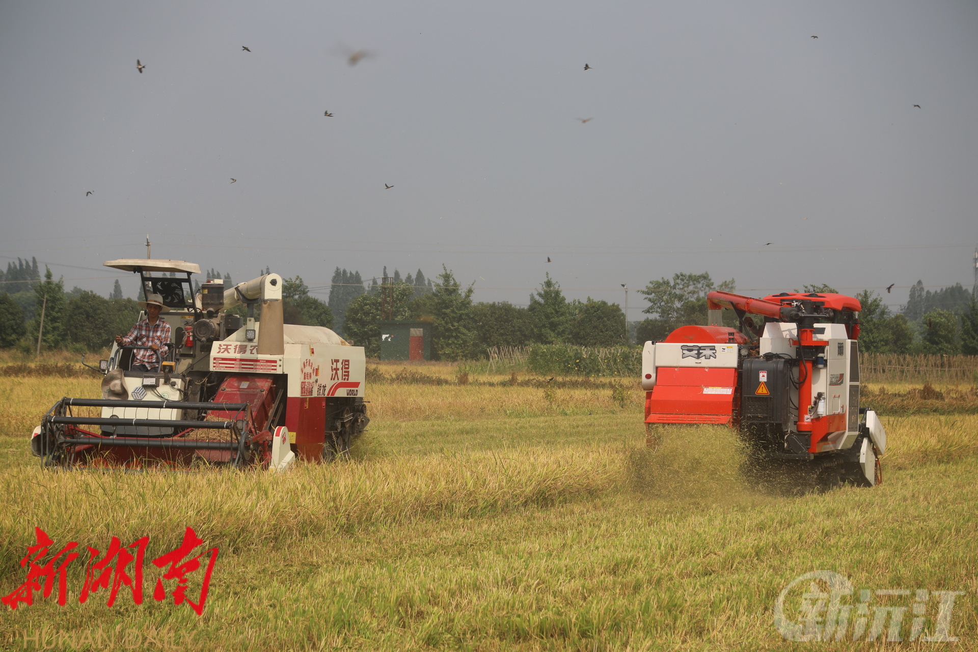 在沅江市草尾镇,一大早,稻穗上的露水刚被蒸发,种粮大户肖建清近400亩双季稻就开始收割。稻田里,两台新型收割机高速运转。