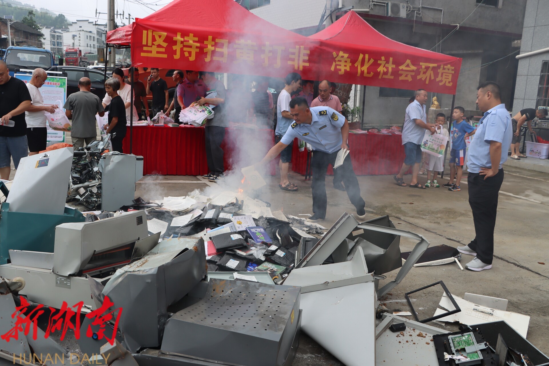 上午9时,“扫黄打非”收缴非法物品 现场销毁及宣传活动在龙溪铺镇楠木社区拉开帷幕。伴随着轰隆的机械作业声及燃烧的火焰,收缴的非法出版物及印刷设备全部变成废墟,现场群众纷纷点赞。同时,工作人员通过展台、展板和资料发放,向现场群众普及“扫黄打非”相关知识,进一步提升了群众对涉“黄”涉“非”的辨别能力和抵制意识。