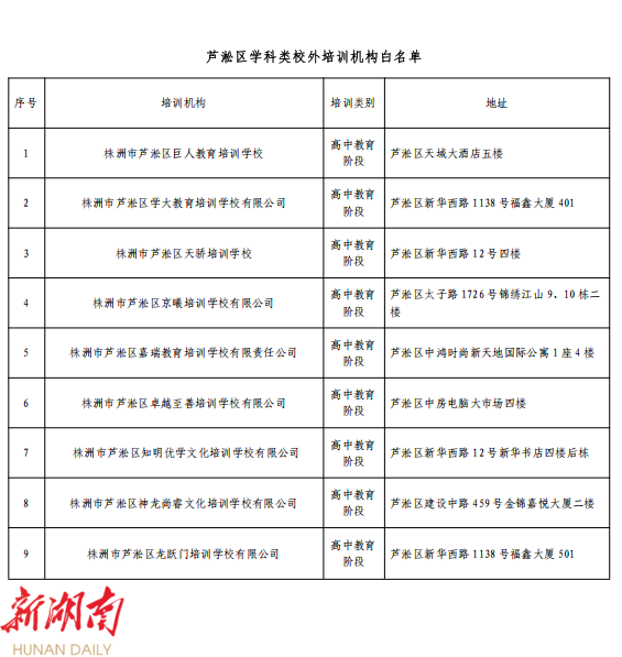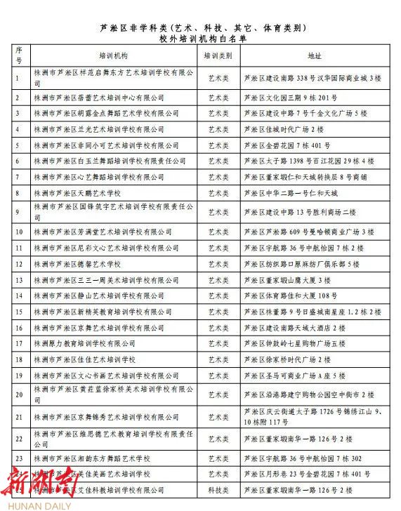 暑假 将至,为贯彻落实国家 “双减”政策,进一步强化对校外培训机构的监督管理,切实维护广大家长学生的合法权益,现将 芦淞 区证照齐全的校外培训机构 “白名单”公布如下,并温馨提示广大家长: