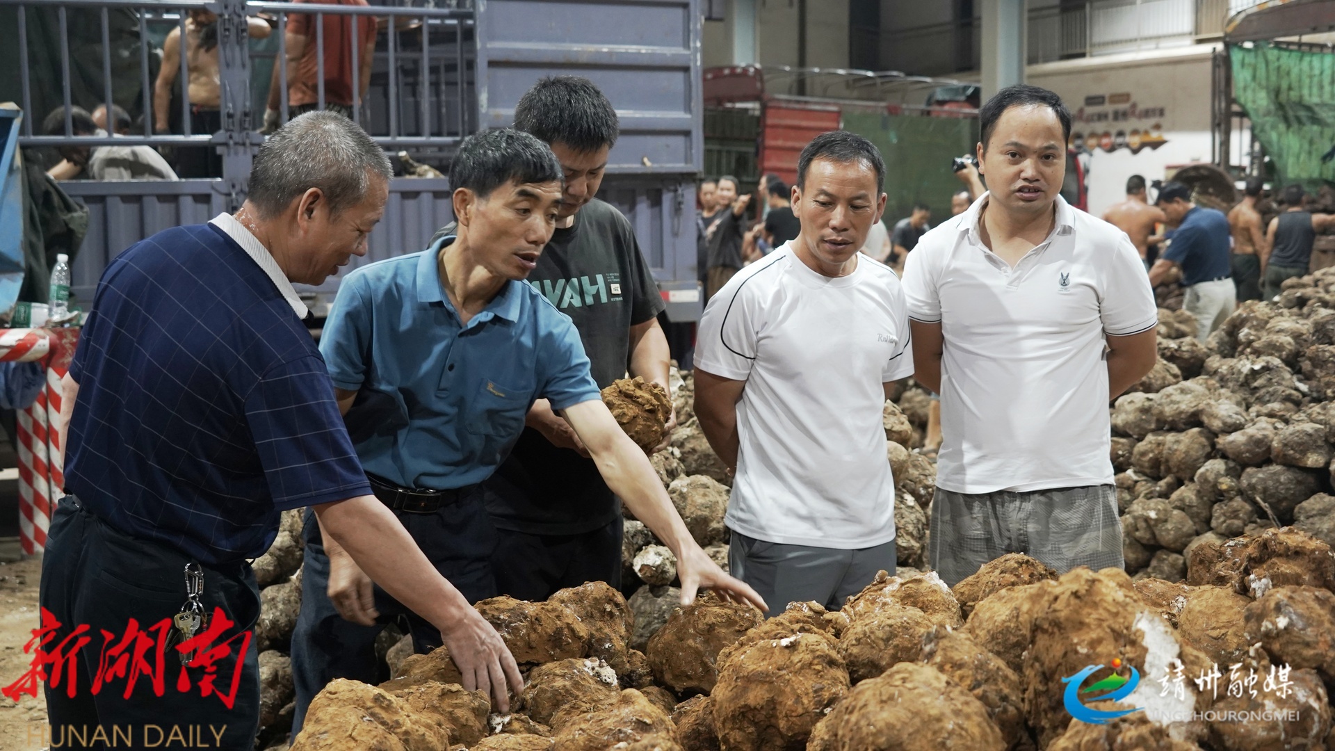 7月22日,靖州茯苓贸易大市场内一片繁忙。工人们有条不紊地卸货搬运,一筐筐新鲜采收的茯苓整齐堆放,往来商户与采购商络绎不绝。靖州是“中国茯苓之乡”,也是全国最大的茯苓集散地、加工及出口基地,茯苓菌种供应和技术推广中心。这里拥有全国最完整的茯苓产业链条、最大的加工交易中心,以及全国唯一的“茯苓价格指数”信息发布平台。每天,来自全国各地的茯苓在此汇聚,经当地加工厂精深加工后,源源不断运往世界各地,日均交易量200吨以上。2024年,靖州全年交易鲜茯苓10万吨、干茯苓6.2万吨,占全国总量的70%以上。