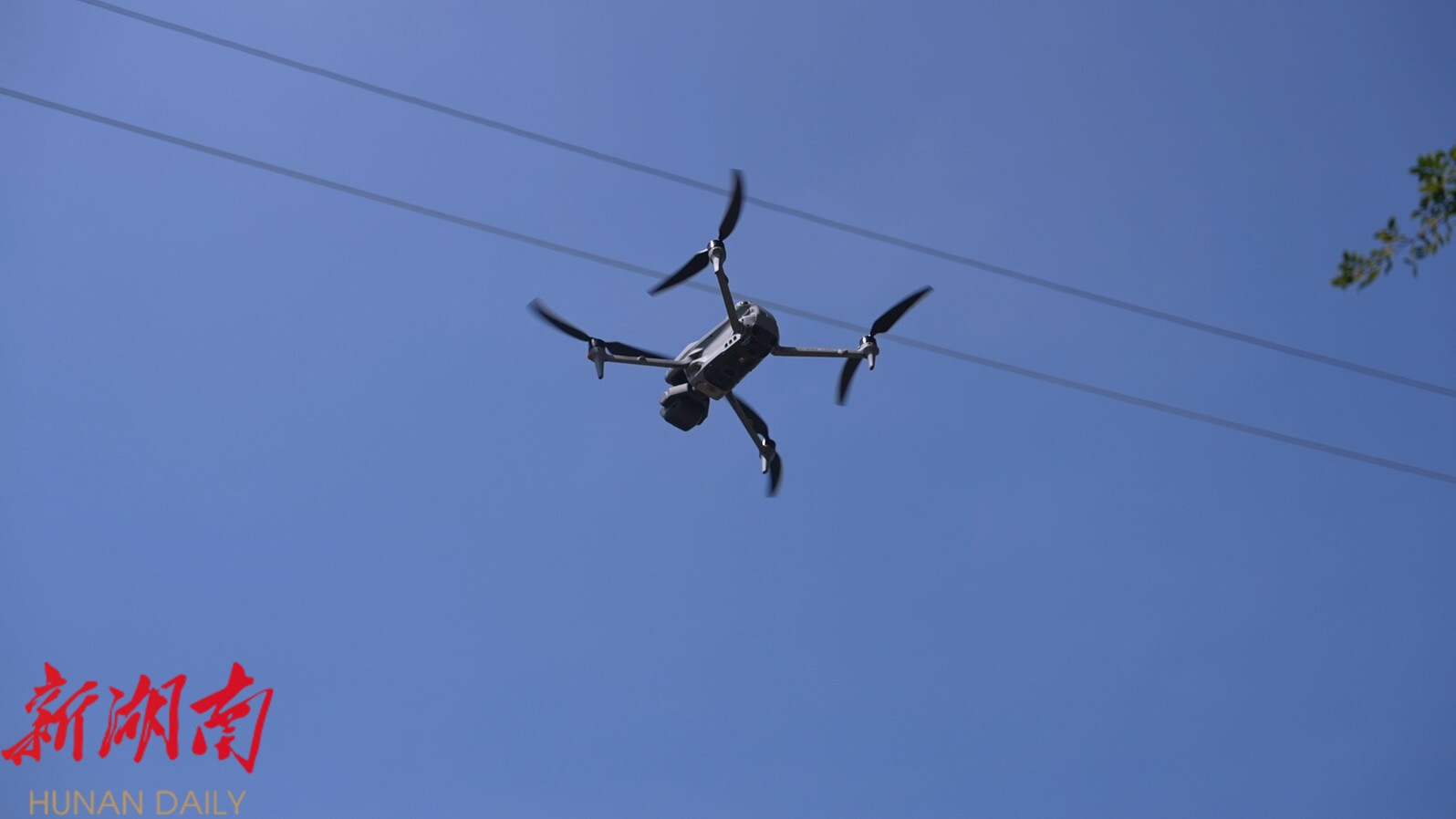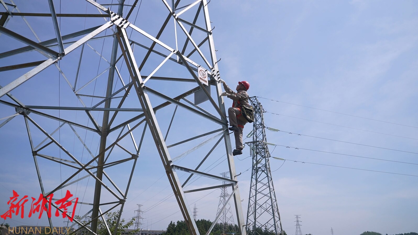 在 一处 110 kV高压线 输电铁塔上,电力检修人员顶着烈日开展登杆作业;与此同时,无人机沿着输电线路巡航,实时排查线路安全隐患。这些都是郴电国际永兴分公司在迎峰度夏期间保障供电的日常工作场景。