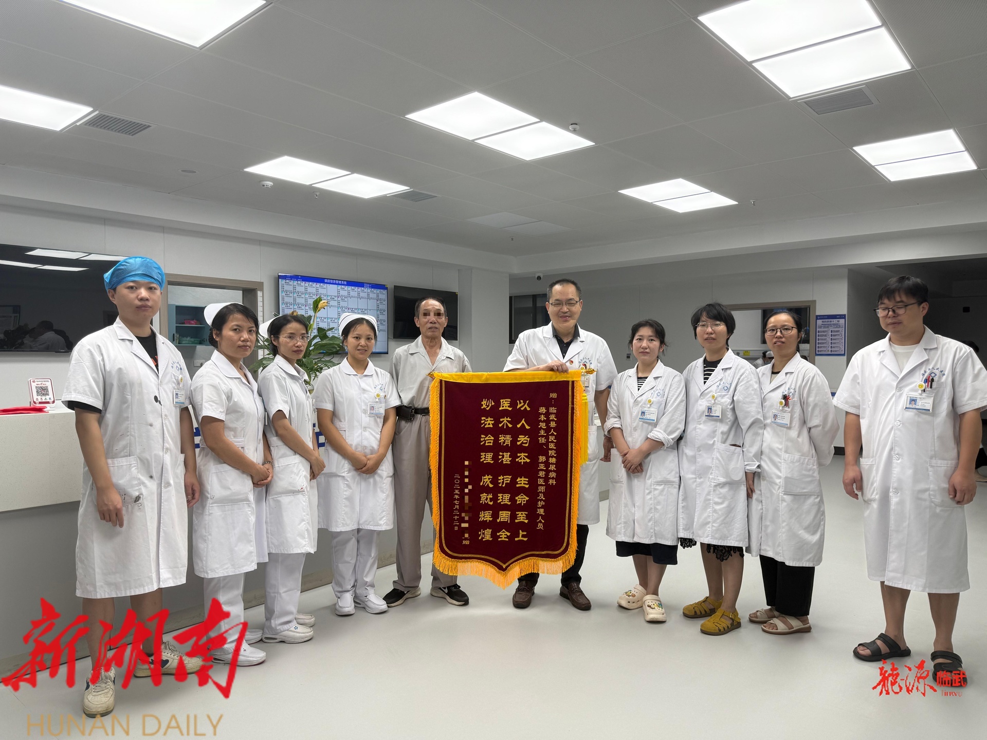 龙源临武客户端7月25日讯(通讯员 黄舒翼 郭亚君)日前,饱受“脆性血糖”困扰的76岁患者陈先生,在临武县人民医院内分泌糖尿病科接受个体化精准治疗后康复出院,并向科室赠送锦旗致谢。