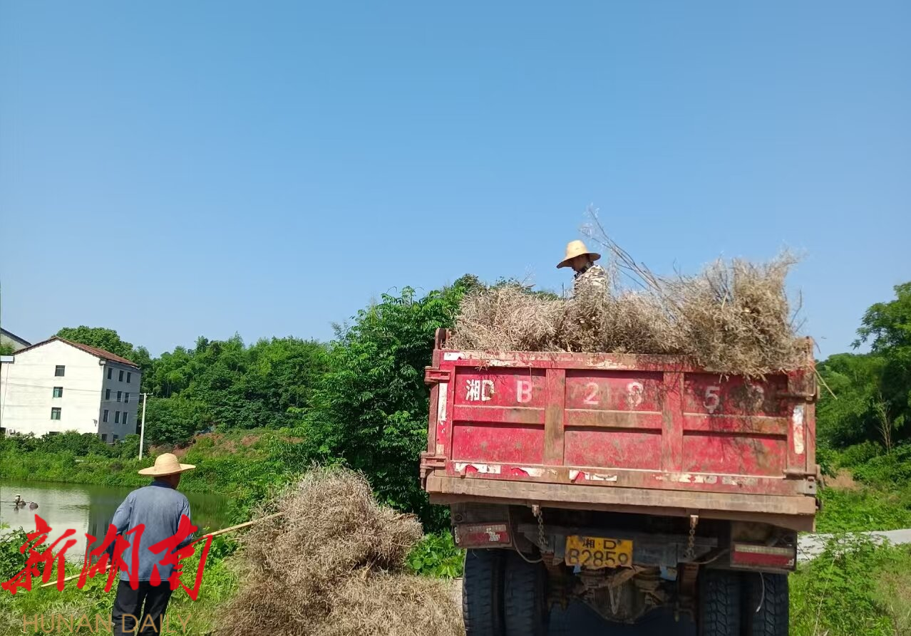 图中为蒸湘区呆鹰岭镇新民村村民正在将秸秆集中装车