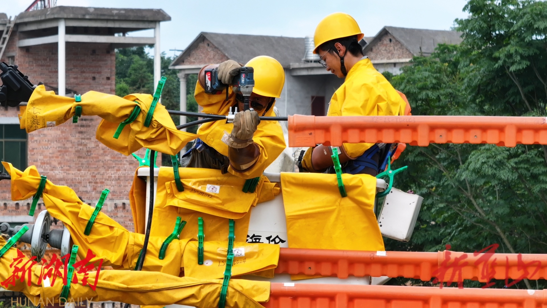 在新圩镇和美村,国网蓝山供电公司不停电作业班员工冒高温顶烈日正在进行带电搭火作业。作业前,工作负责人精心组织班前会,详细交代当日高温风险点、安全注意事项和应急预案,并对现场环境、设备参数等进行全面勘察和细致评估。作业中,他们全副武装,穿戴绝缘服、安全帽、绝缘手套,随绝缘斗臂升至数米的高空开展带电作业,高效完成带电连接引流线系列操作,全过程辖区电力用户“零感知”。