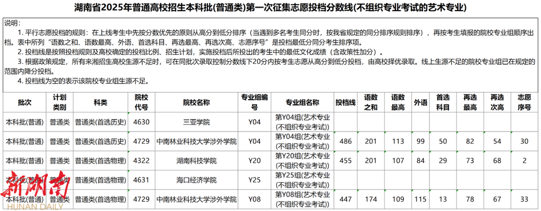 湖南省2025年普通高校招生本科批(普通类)第一次征集志愿投档分数线(不组织专业考试的艺术专业)