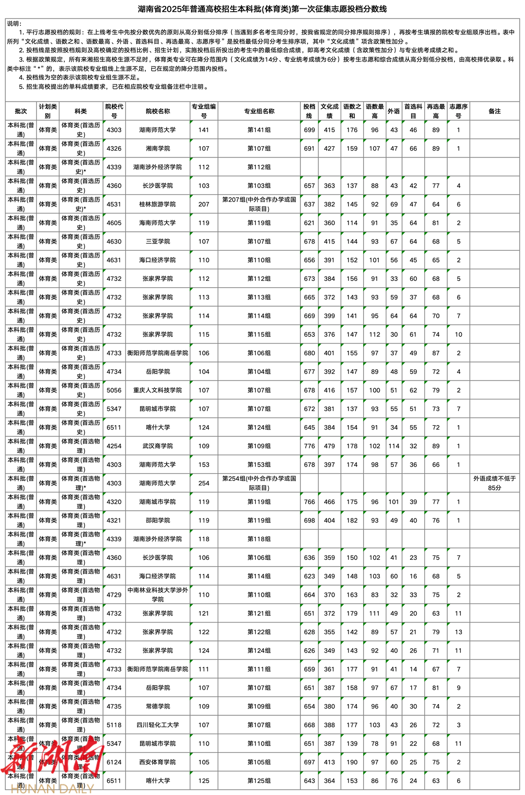 湖南省2025年普通高校招生本科批(体育类)第一次征集志愿投档分数线