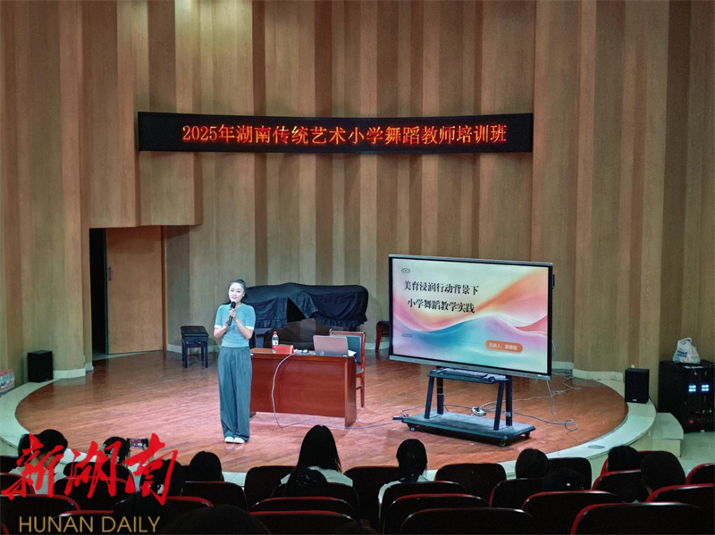 湖南日报·新湖南客户端7月29日讯(通讯员 黄佳) 湖南第一师范学院内,舞韵与思想持续激荡。7月28日,湖南省特色传统文化教育(小学舞蹈)专题培训班,邀请全国中小学生艺术展演优秀指导教师廖璐璐开展《美育浸润行动背景下小学舞蹈教学实践》专题讲座,为参训教师们点亮了将传统文化与美育深度融合的创新教学明灯。