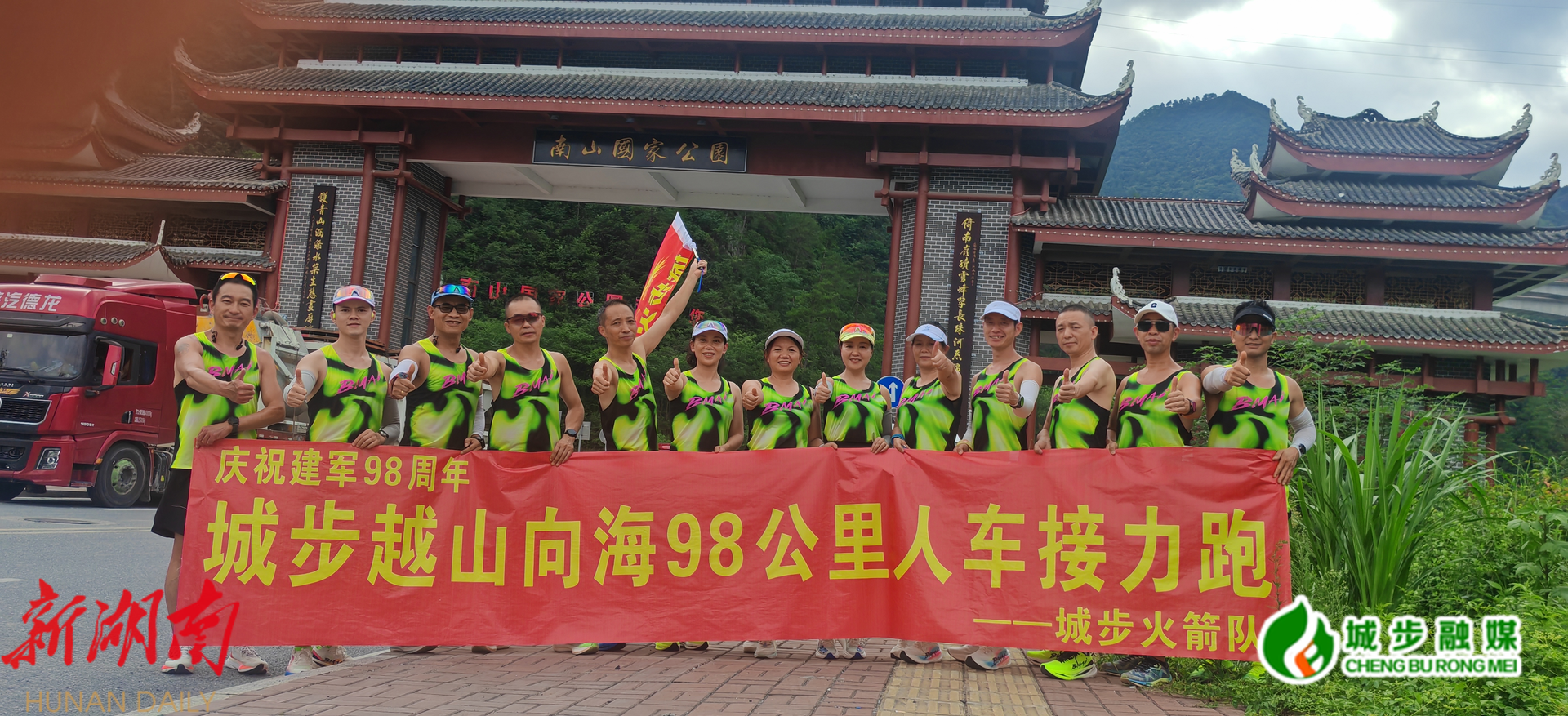 新城步客户端7月29日讯 (通讯员 杨恒宇) 7月27日,在庆祝中国人民解放军建军98周年暨第27届湖南(南山)六月六山歌节来临之际,南山风景名胜区迎来了一场别开生面的体育盛事——“奔跑吧,南山”城步越山向海98公里人车接力跑,活动以“民族团结 健康同行”为主题,吸引了当地跑步爱好者、退伍军人、返乡大学生及户外运动达人共同参与,用激情奔跑展现活力与风采。