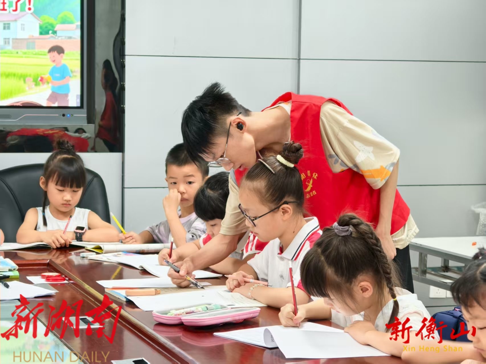 7月29日,记者走进衡山县幸福村党群服务中心看到,在志愿者耐心细致的看护下,20余名中小学生神情专注,围坐在书桌旁,或做功课,或阅读课外书。志愿者们耐心细致地帮助孩子们完成作业,以课程辅导为“小切口”,为乡村留守儿童提供“陪伴”的“大能量”。