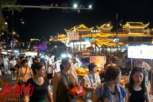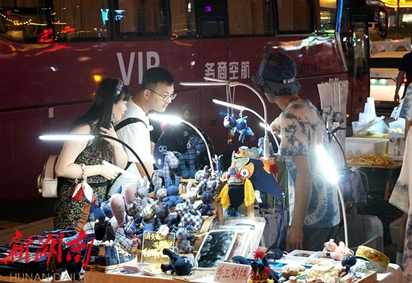 沿着高云路一路走去,各色商品琳琅满目。除了葛根糕、臭豆腐、鲜榨果汁等美食摊点,还有不少售卖扎染、木雕、银饰的手工艺品摊位,每一处摊点都充满了浓郁的地方特色,吸引了众多游客驻足挑选。不少摊主都表示,《魅力湘西》每晚三场模式开启后,带来了更多人流量,销售额也随之上涨。