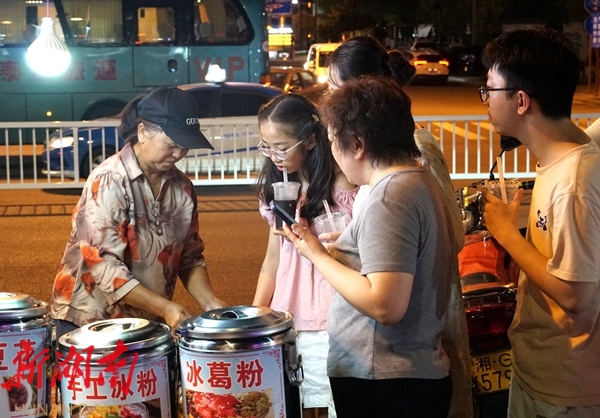 在众多摊点中,胡大姐的糖水摊前总是围着三五顾客。“我就住在不远处的宝峰路社区,在这里摆摊卖糖水很多年了,今年明显感觉摆摊的人多起来了,生意也比往年好很多,一天能卖个两百多块呢。”胡大姐一边麻利地为顾客盛着糖水,一边笑着说道。