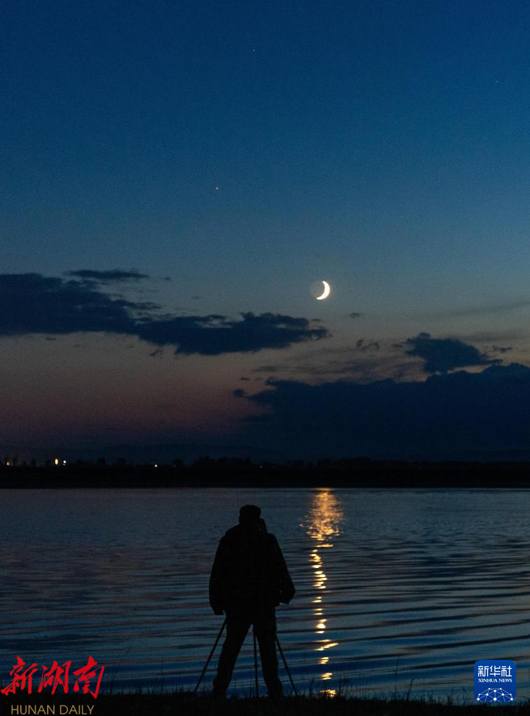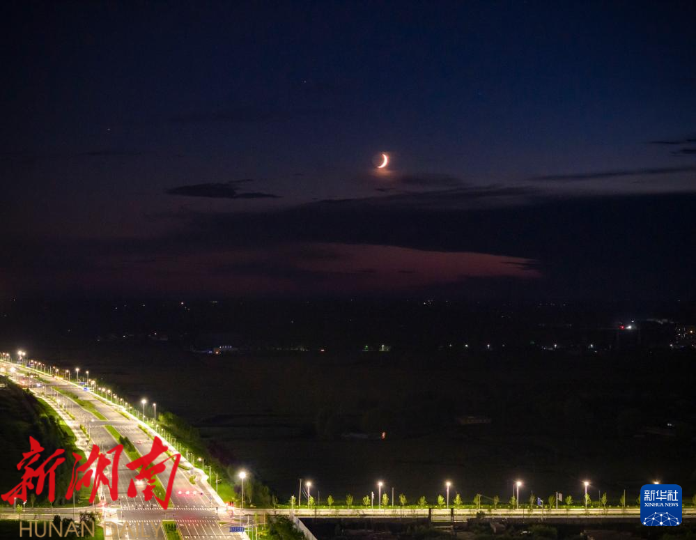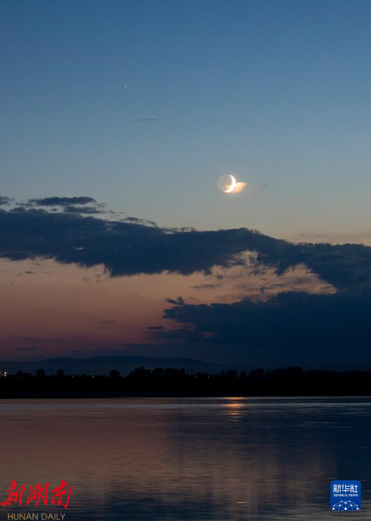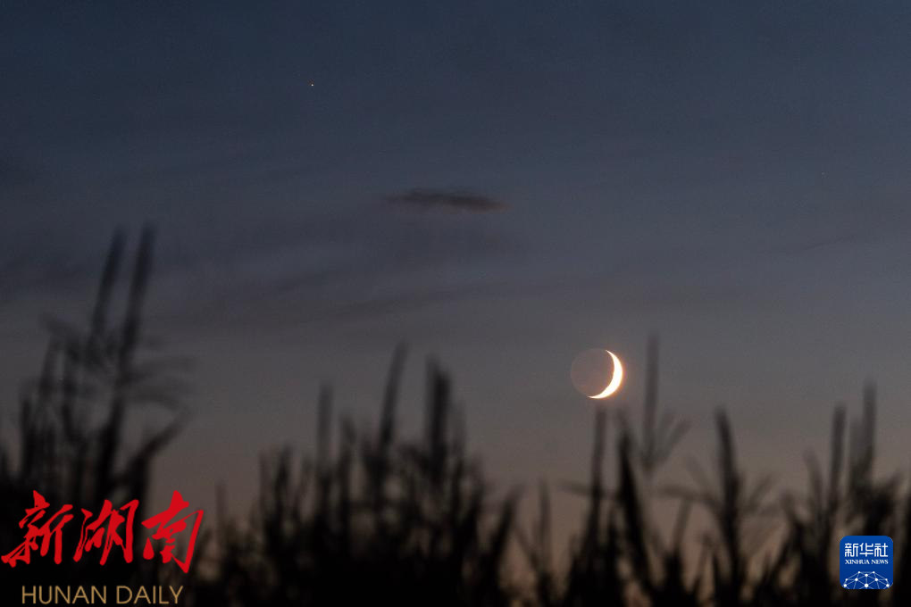 当日,夜空上演火星伴月,微微泛红的火星与一弯蛾眉月近距离相伴。新华社发(刘万平摄)