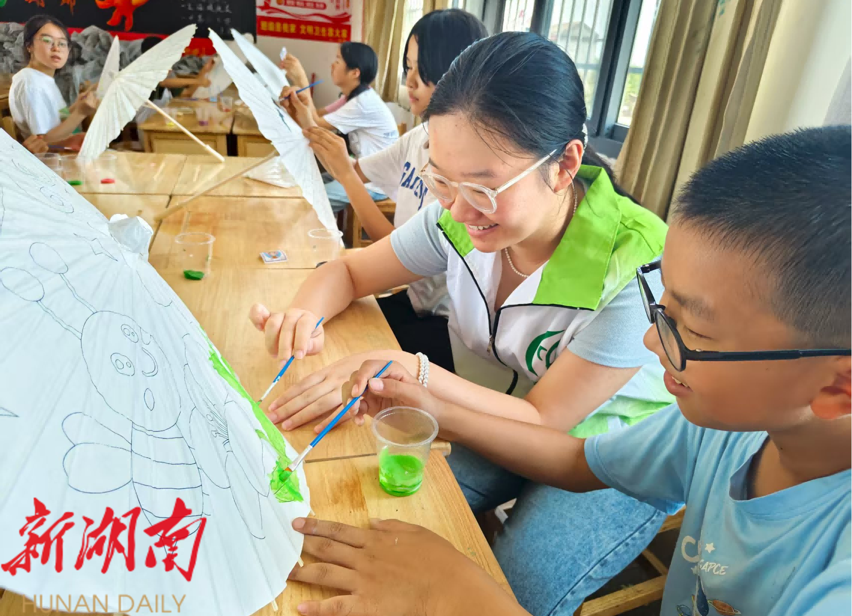 湖南日报·新湖南客户端7月29日讯(通讯员 方乐怡)7月28日,湘阴县三塘镇民政社工站联合三塘中学,将传统非遗课堂搬进校园,50余名孩子化身“小画师”,在“巧手绘伞、童心传艺”活动中亲手描绘心中的油纸伞。