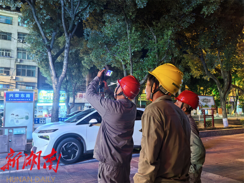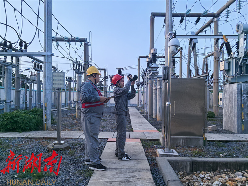 迎峰度夏期间,国网岳阳县供电公司创新采用“白+黑”保电接力模式,白天通过带电作业实现检修“零停电”、客户“零感知”,确保居民与企业用电无忧;夜间则组织工作人员分片、分时段开展变电站及线路夜巡测温,利用红外测温仪对主变套管、刀闸刀口等易发热点精准测温并记录,筑牢设备安全运行防线。