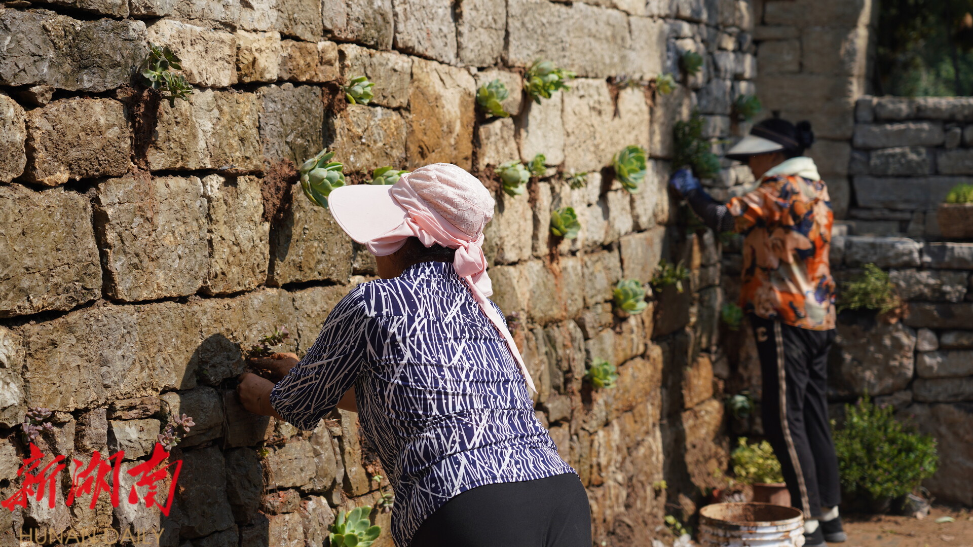中方融媒7月30日讯 (记者:石端 陈攀 潘庸)7月29日,在荆坪古村的石墙下,园艺师们正忙得热火朝天。她们手持多肉植物,小心翼翼地将其嵌入石墙缝隙。这些原本粗犷的石墙,正被精心打造为充满生机的微景观。
