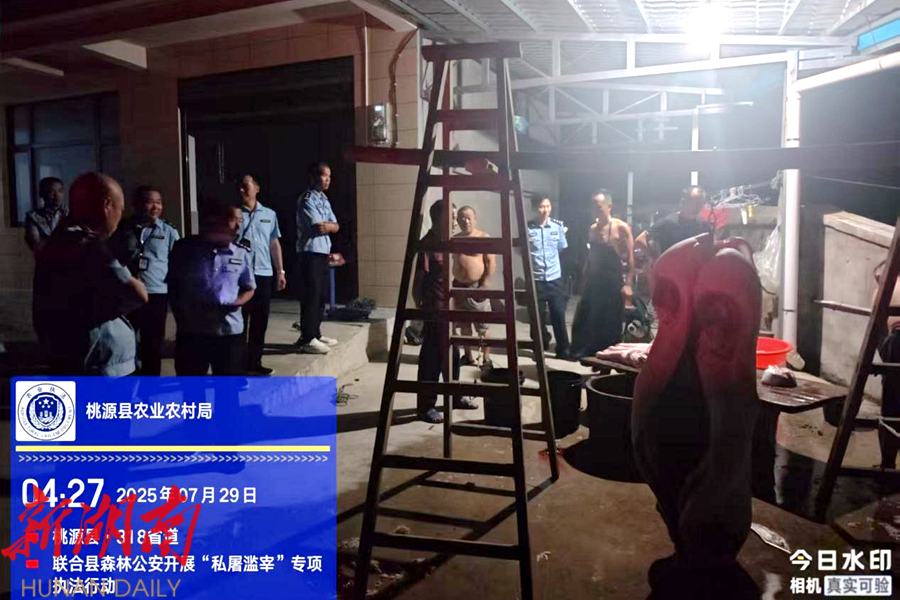 视外桃源客户端7月29日讯(通讯员: 薛建 李满春 ) 为筑牢食品安全防线,规范肉类市场经营秩序,7月29日凌晨2时,桃源县农业综合行政执法大队联合县森林公安,针对理公港镇私屠滥宰乱象开展专项整治行动,精准打击非法屠宰行为。