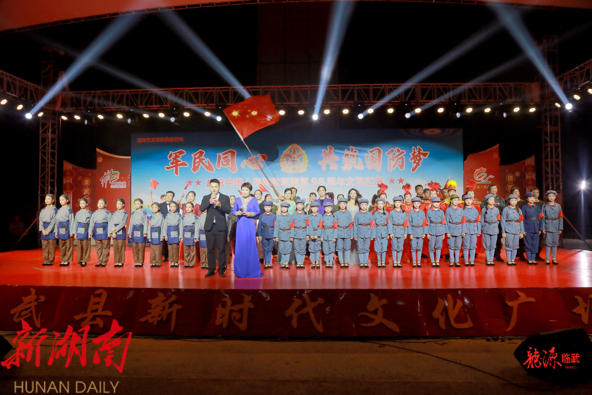 龙源临武客户端7月30日讯(记者 何城基 胡懿 通讯员 郑飞鹰)为庆祝中国人民解放军建军98周年,弘扬拥军优属、拥政爱民光荣传统,展现临武军民团结风采,7月29日,临武县在微电影城新时代文化广场举行“军民同心·共筑国防梦”文艺汇演。