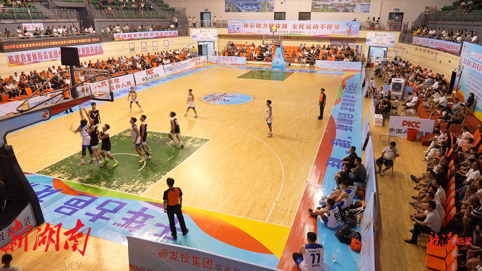 在临武县文体中心篮球馆,比赛现场气氛热烈,如同盛夏的骄阳,场上队员们个个斗志昂扬、奋力拼搏;场下观众热情似火,呐喊助威声此起彼伏。