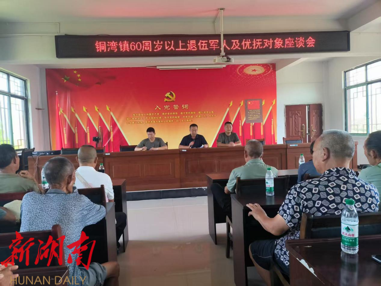 中方融媒7月30日讯 (通讯员:米湘)在中国人民解放军建军98周年来临之际,为弘扬拥军优属优良传统,切实将党和政府对退役军人的关心关怀落到实处,7月30日,铜湾镇退役军人服务站召开“八一”退役军人座谈会。辖区内60周岁以上退役军人齐聚一堂,共忆热血军旅,共话乡镇发展。