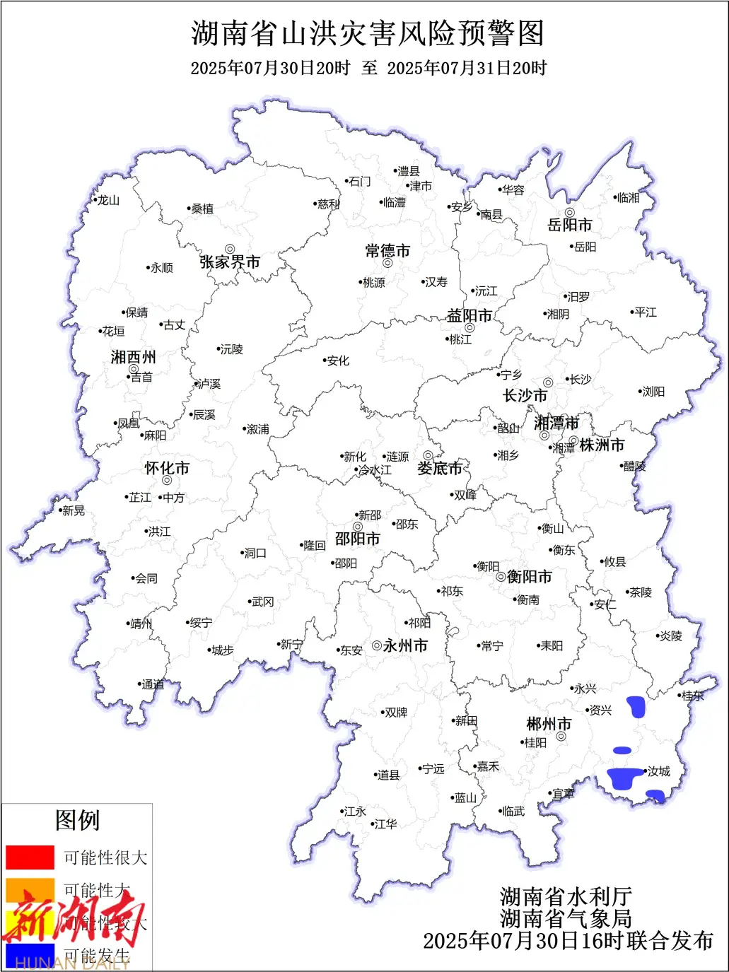 受降雨影响,30日20:00至31日20:00,郴州市东南部局地可能发生山洪灾害。