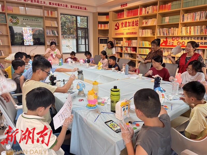 湖南日报·新湖南客户端7月30日讯(通讯员 贺玉佳)“妈妈,以后我要经常回书屋来看我的皮卡丘!”7月29日晚,樟树镇文谊新村农家书屋内,11岁的刘煦楠捧着刚画好的石膏娃娃雀跃不已。这个由“星火暑期课堂”精心策划的手工活动,让20余组亲子家庭在书香中体验创作的快乐。特别的是,每个孩子精心绘制的卡通石膏娃娃都将被珍藏在书屋展示区,这种“以作品留人”的创新方式,让小小创作者们有了常回书屋的动力。