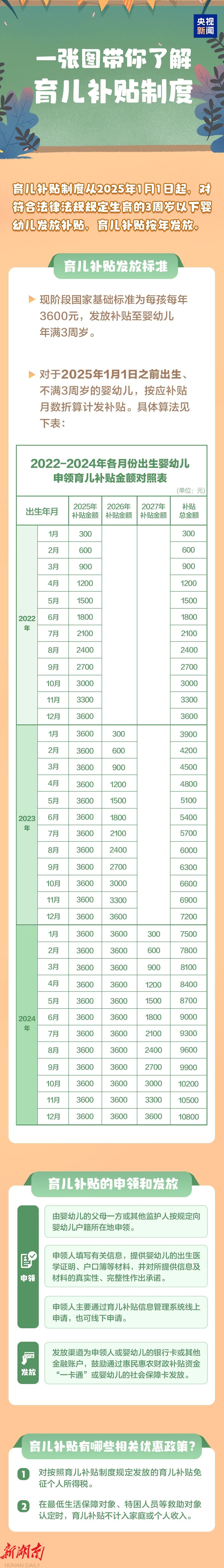 《实施方案》明确了 补贴对象和标准 , 育儿补贴制度从2025年1月1日起,对符合法律法规规定生育的3周岁以下婴幼儿发放补贴, 育儿补贴按年发放,现阶段国家基础标准为每孩每年3600元 ,发放补贴至婴幼儿年满3周岁。