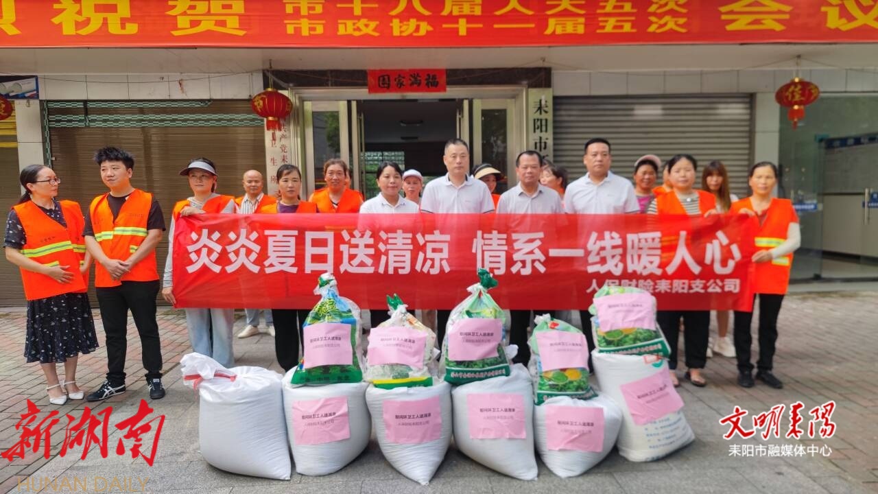 耒阳融媒7月30日讯(记者 李靖宇 刘喜) 7月29日,人保财险耒阳支公司积极践行社会责任,开展了“炎炎夏日送清凉 情系一线暖人心”活动,为奋战在高温下的耒阳一线环卫工人送去了关怀与清凉。