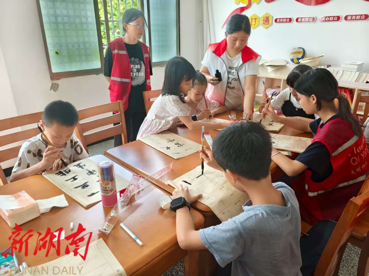 活动伊始,孩子们在农家书屋浓厚的文化氛围中开启了毛笔字练习,通过社工和志愿者的耐心指导,孩子们熟练掌握了毛笔握笔、运笔的方法技巧,了解了汉字的结构与文化内涵,在一笔一划的临摹中感受中华优秀传统文化的魅力。为了加强儿童的防溺水意识,活动还特别设置了防溺水主题绘画环节,通过社工和志愿者生动的讲解,让孩子们充分了解防溺水的重要性,并鼓励孩子们用画笔将“七彩童年,‘泳’远安全”的安全理念化作一幅幅主题鲜明、富有感染力的画作。